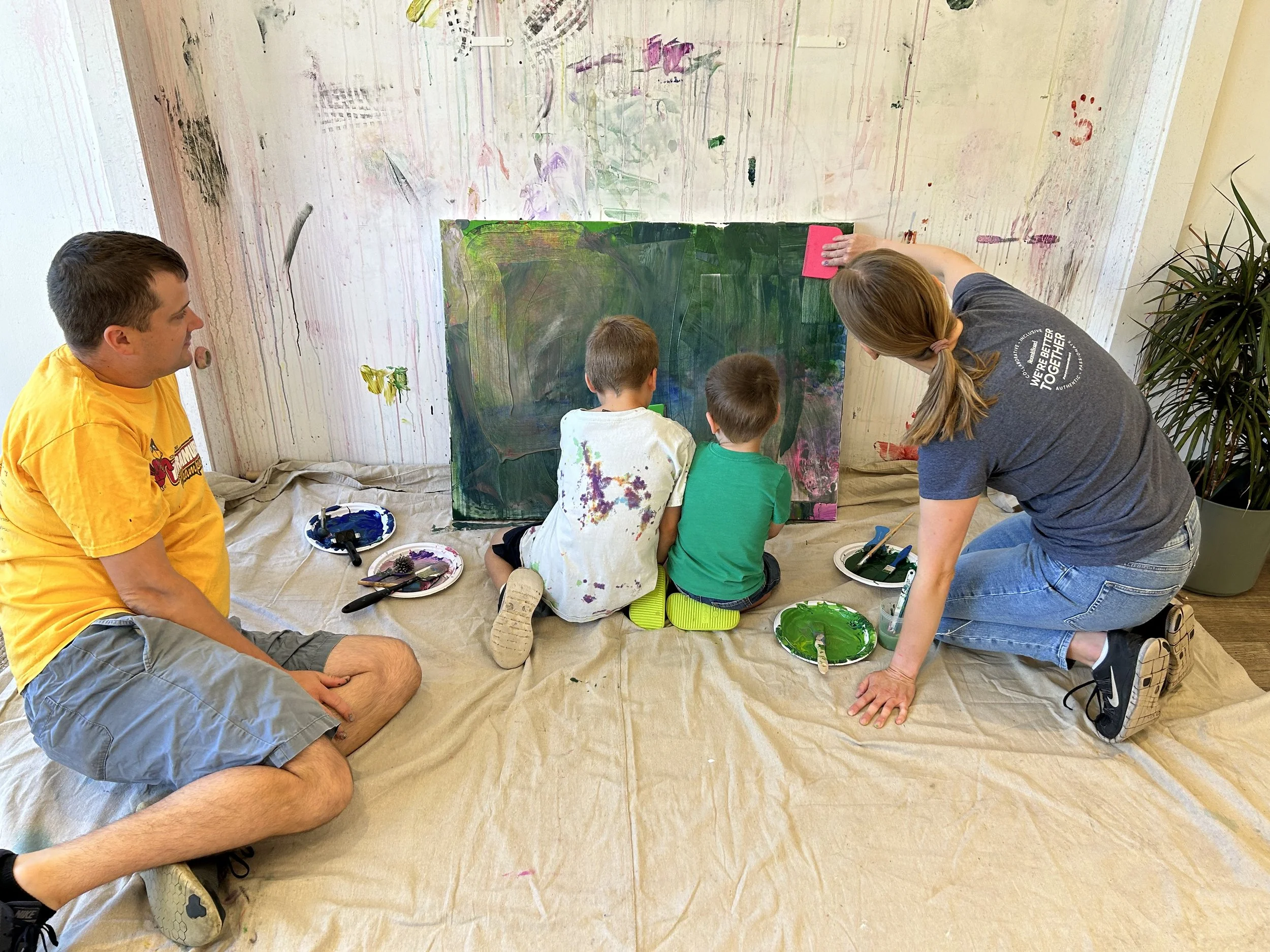 Family Create is a workshop for families to come together, create, be playful and connect over an abstract family painting. This workshop includes free art making time as well as guidance on a collaborative painting (paint mixing, material exploration and layering). When complete and dried, Heart Space will seal painting and arrange pick up.